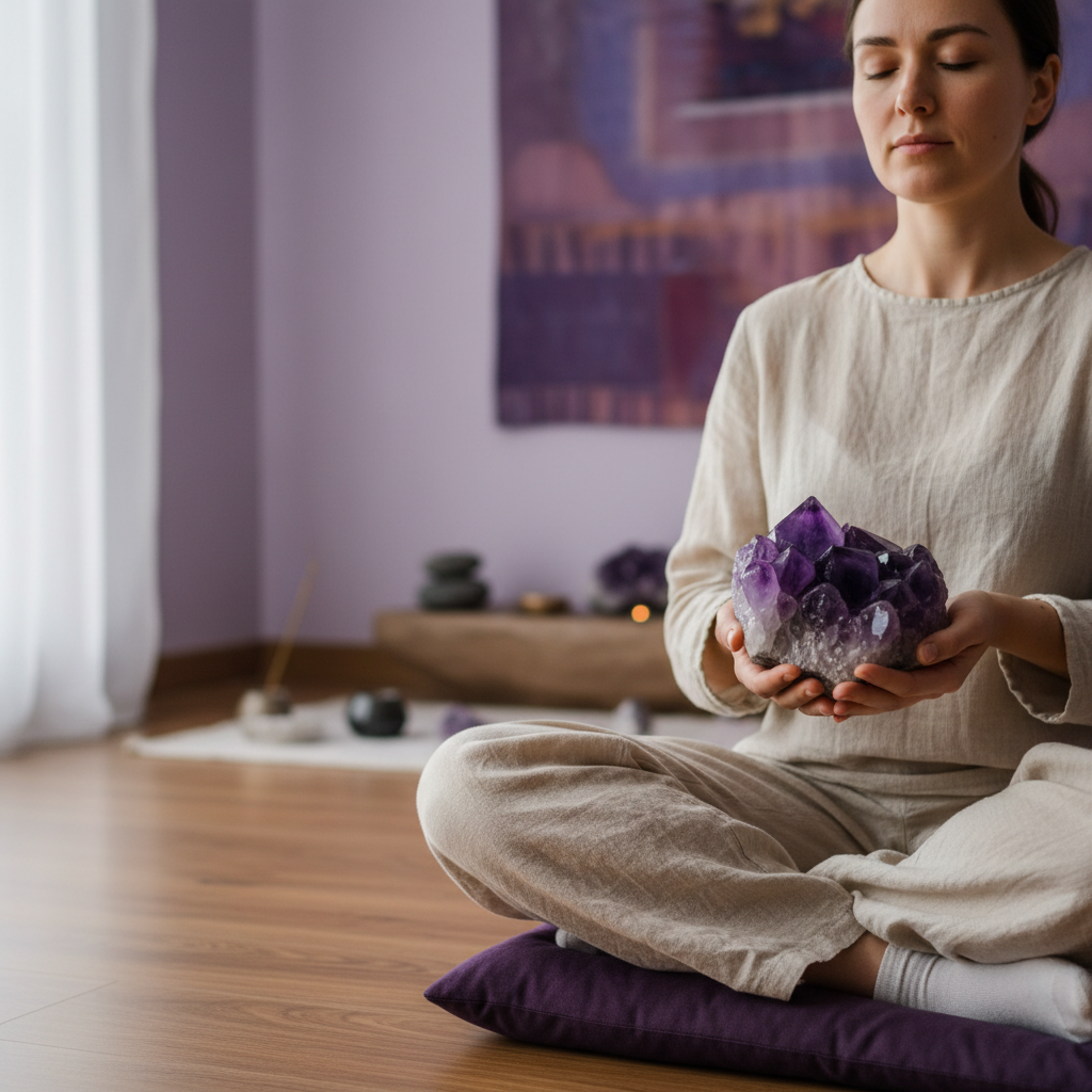 Shraddha Mittal, founder of GemsStore, smiling warmly while holding an amethyst crystal