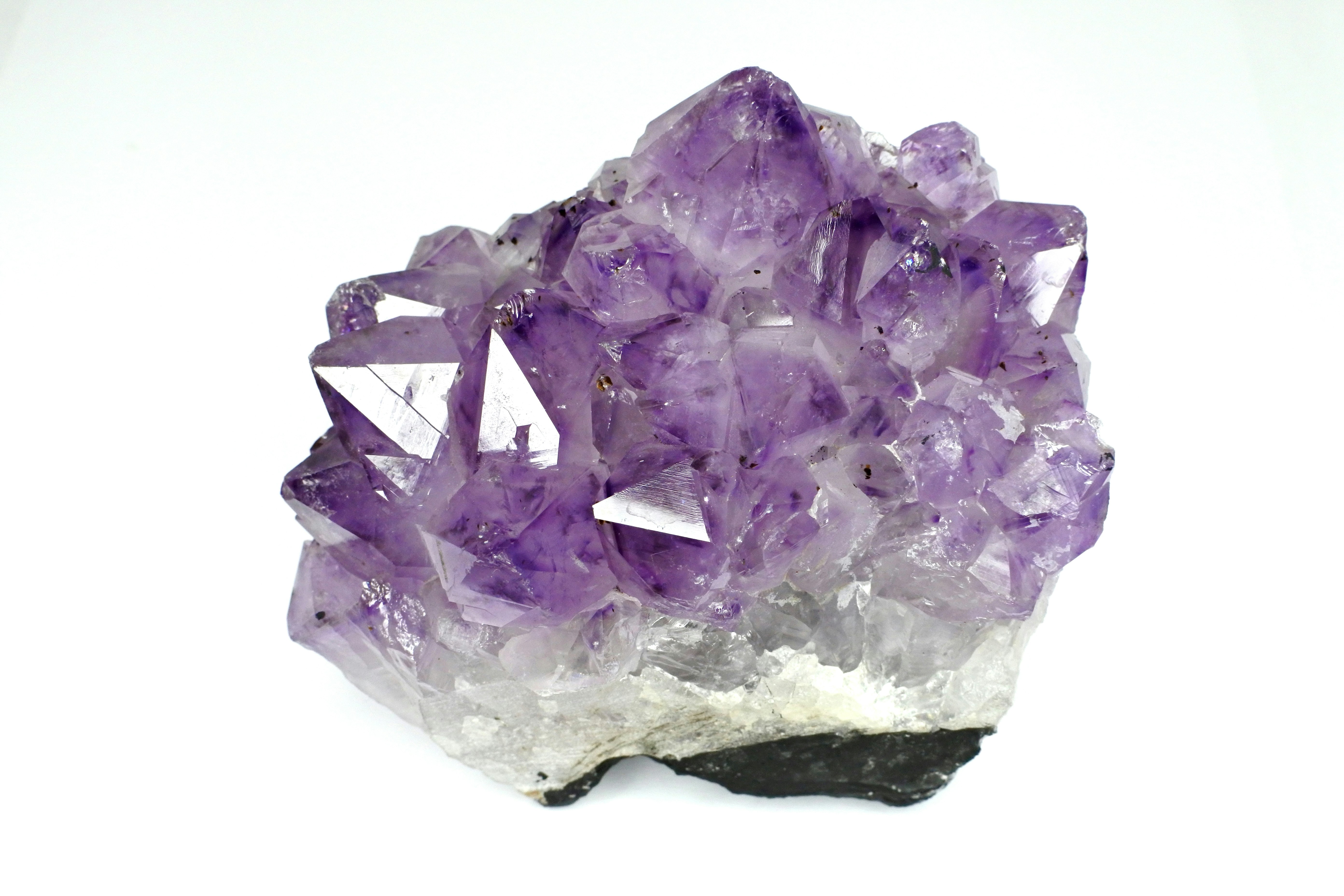 Deep purple amethyst geode crystal cluster front view on white background